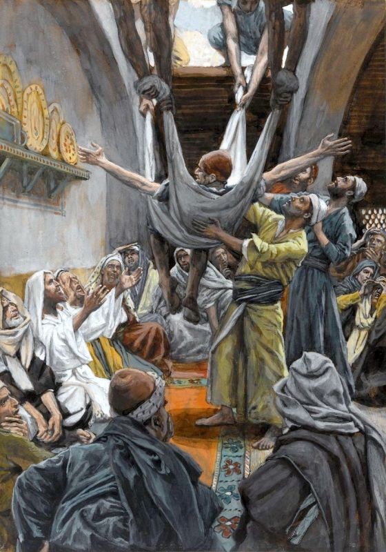 Pewnego dnia, gdy Jezus nauczał, siedzieli przy tym faryzeusze i uczeni w Prawie, którzy przyszli ze wszystkich miejscowości Galilei, Judei i Jerozolimy. A była w Nim moc Pańska, że mógł uzdrawiać. Wtem jacyś ludzie niosąc na łożu człowieka, który był sparaliżowany, starali się go wnieść i położyć przed Nim. Nie mogąc z powodu tłumu w żaden sposób go przynieść, wyszli na płaski dach i przez powałę spuścili go wraz z łożem w sam środek przed Jezusa. On widząc ich wiarę rzekł: Człowieku, odpuszczają ci się twoje grzechy. Na to uczeni w Piśmie i faryzeusze poczęli się zastanawiać i mówić. Któż On jest, że śmie mówić bluźnierstwa? Któż może odpuszczać grzechy prócz samego Boga? Lecz Jezus przejrzał ich myśli i rzekł do nich: Co za myśli nurtują w sercach waszych? Cóż jest łatwiej powiedzieć: Odpuszczają ci się twoje grzechy, czy powiedzieć: Wstań i chodź? Lecz abyście wiedzieli, że Syn Człowieczy ma na ziemi władzę odpuszczania grzechów – rzekł do sparaliżowanego: Mówię ci, wstań, weź swoje łoże i idź do domu! I natychmiast wstał wobec nich, wziął łoże, na którym leżał, i poszedł do domu, wielbiąc Boga. Wtedy zdumienie ogarnęło wszystkich; wielbili Boga i pełni bojaźni mówili: przedziwne rzeczy widzieliśmy dzisiaj.
