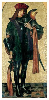 Przedstawiany jako żołnierz. Jego atrybutem jest: palma, miecz, krzyż.