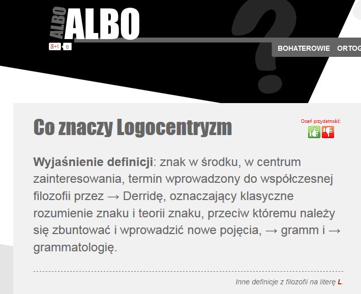 Natrafiłem w sieci na lewicową fałszywkę definicji pojęcia logocentryzmu (zdjęcie poniżej). Według lewicowej wrzutki twórcą pojęcia był żydowski „filozof” Derrida, który w gronie sobie podobnych miał ambicję przyczyniać się do degeneracji cywilizacji łacińskiej za pomocą stworzonego przez siebie „postmodernistycznego” prostego cepa: dekonstrukcji – przeinaczonej interpretacji nie tylko tekstu, lecz także kultury, filozofii i religii. /zgodnie z wytycznymi zachodnioeuropejskiego neokomunizmu/.