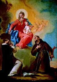 Nicola Grassi, “Matka Boża Różańcowa ze św. Dominikiem i św. Franciszkiem”, olej na płótnie, I poł. XVIII w., Narodowa Galeria Słowenii, Lublana.