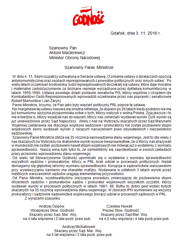 Od wielu lat Stowarzyszenie Godność upominało się o wydalenie z wymiaru sprawiedliwości wszystkich sędziów i prokuratorów, którzy w PRL brali udział w procesach politycznych. Nadal domagamy się głębokiej reformy wymiaru sprawiedliwości. Korupcja w sądownictwie warszawskim przy wywłaszczaniu kamienic ma charakter mafijny. Wydawane w ostatnich 3 latach wyroki przez niektórych warszawskich sędziów urągają elementarnej przyzwoitości.