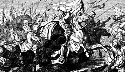 Pamiętam, że w pewnym zakątku scriptorium wisiała miniaturka przedstawiająca zwycięstwo Karola Młota nad muzułmańskim najeźdźcą w 732 roku, w bitwie pod Poitiers.