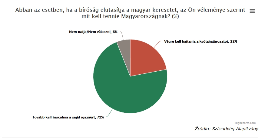 Tymczasem 72 % ankietowanych Węgrów opowiada się za kontynuowaniem walki przeciwko obowiązkowym “kwotom relokacyjnym”. 22 proc. badanych uważa, że w razie oddalenia skargi państwo węgierskie powinno ustąpić w tej kwestii. Sondaż przeprowadzono w dniach 1-4 września.