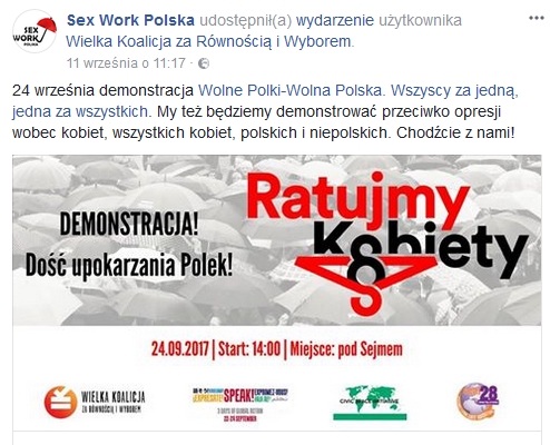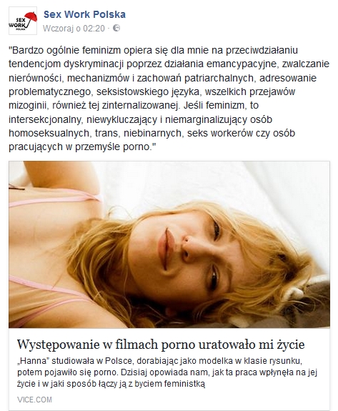 Jako feministki i feminiści odrzucamy mizoginistyczne opinie, zgodnie z którymi pracownice seksualne „sprzedają siebie” czy „sprzedają własne ciało”. Założenie, że seks wiąże się z oddaniem lub utratą części siebie, uważamy za głęboko anty-feministyczne. Nie zgadzamy się również z przekonaniem, że pracownice seksualne przyczyniają się do „utowarowienia kobiet, seksu i intymności”. To nie pracownice seksualne są winne takiemu stanowi rzeczy lecz patriarchat i inne formy opresji. (…) Antyprostytucyjne ustawodawstwo jedynie pogarsza sytuację osób LGBT świadczących usługi seksualne ignorując wielość doświadczanych przez nie form marginalizacji /feministsforsexworkers/