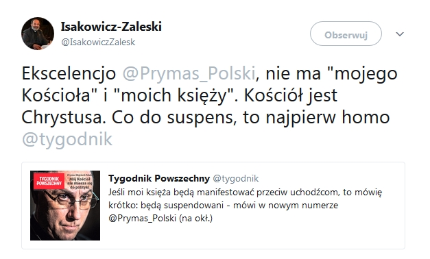 Na początku chciałbym podkreślić, że mam olbrzymi szacunek dla urzędu jaki piastuje Prymas Polski Wojciech Polak, ale także osobisty, bo z księdzem arcybiskupem znamy się prywatnie. Nie zmienia to faktu, że trudno jest mi przyjąć w pełnej rozciągłości jego słowa. Zdaję sobie sprawę, że ta wypowiedź padła w wywiadzie, a więc jest ona miejscami lakoniczna i bardzo zwięzła. Tym bardziej zastanawia mnie pewna ostrożność w formułowaniu samooceny własnych wypowiedzi dot. spraw politycznych, a z drugiej strony radykalizm w kwestiach tak newralgicznych jak kwestia uchodźców. Nie ukrywam, że jestem wręcz poruszony, żeby nie powiedzieć zbulwersowany, ostrzeżeniem dotknięcia suspensą księży, którzy pojawiliby się na ewentualnych manifestacjach przeciwko przyjmowaniu do Polski uchodźców.