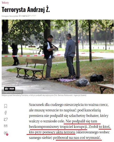 „Szacunek dla cudzego nieszczęścia to ważna rzecz, ale muszę wreszcie to napisać: pod kancelarią premiera nie podpalił się szlachetny bohater, który walczy o wzniosłe cele. Nie podpalił się tam bezkompromisowy tropiciel korupcji. Zrobił to ktoś, kto przy pomocy aktu terroru (skierowanego wobec samego siebie) próbował na nas coś wymusić”.