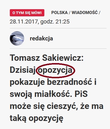 Niestety, publicysta ma rację. Wystarczy zerknąć jeden z bałamutnych tytułów na Niezalezna.pl. Karanie zdrajców według tytułu i treści notki ma być domeną…targowicy, a nieadekwatne słowo opozycja przewija się na tym portalu non stop.