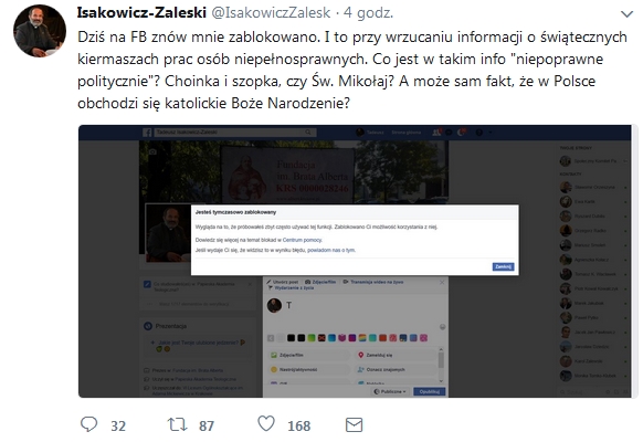 Na FB blokują nieustannie. Wczoraj znów zablokowano (czasowo) jedną osobę udostępniającą posty z Ekspedyta w grupach. Na Twitterze jest lepiej, ale jak pisałem od czasu do czasu likwidują konta i stosują ukrywanie jak powyżej, zrównując normalne treści z treściami pornograficznymi, które są jawnie rozpowszechniane na TT. Po odblokowującym kliknięciu można wszystko zobaczyć. Reasumując: na TT jest najlepiej.