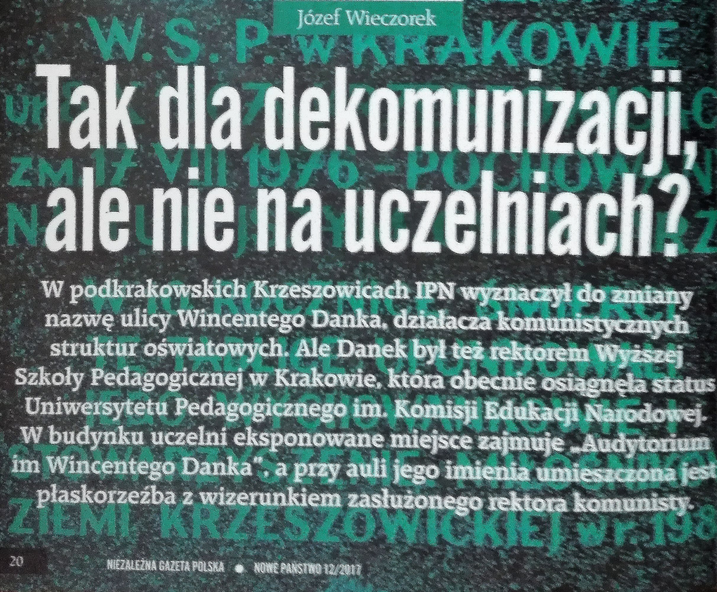 Ale Wincenty Danek jako zasłużony działacz partyjny był też po 1956 r. rektorem Wyższej Szkoły Pedagogicznej w Krakowie, która obecnie osiągnęła status Uniwersytetu Pedagogicznego im. Komisji Edukacji Narodowej. W budynku uczelni eksponowane miejsce zajmuje ‚Audytorium im Wincentego Danka’, a przy auli jego imienia umieszczona jest płaskorzeźba z wizerunkiem zasłużonego rektora-komunisty.