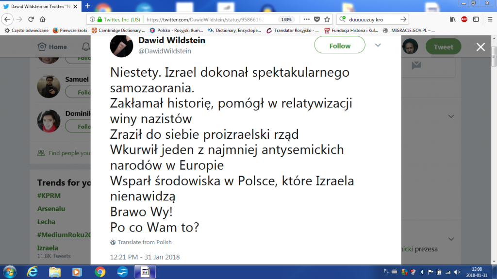 Ciemny Lud zobaczył na własne oczy, i to na ekranach wszystkich telewizorów w Polsce, a nie na monitorach laptopów należących do niszowej grupy realistów, zwanych dla stygmatyzowania oszołomami lub/i antysemitami, że Żydom spadły maski, spod których wyłoniła się twarz Izraelczyka wychowywanego w nienawiści do Polski przez cały system edukacji i propagandy, jakim dysponuje państwo Izrael,