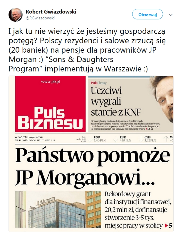 Więcej pożytku dla Polski byłoby, gdyby owe 20 mln. rozdysponować wśród polskich firm produkujących dla Polski i w Polsce płacących podatki. Tymczasem rząd Morawieckiego zasila trzos banku, który został sprowadzony do naszego kraju w celu regulacji strumienia kapitału dla obcych firm.