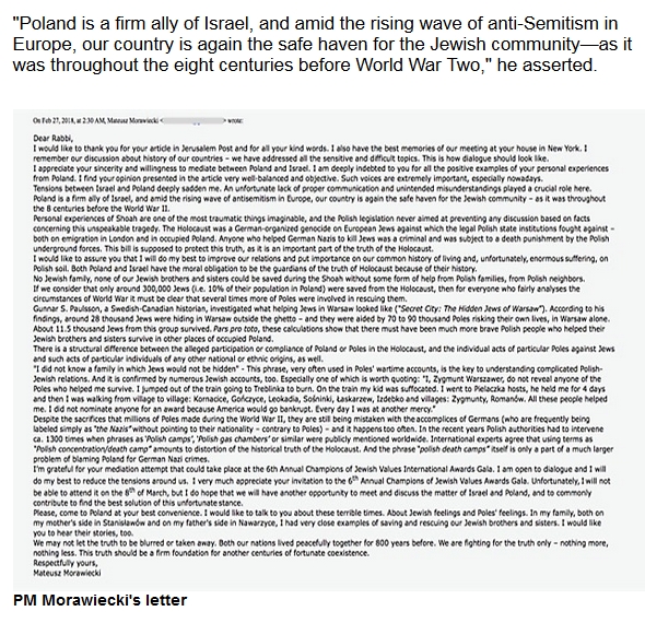 O samym Morawieckim rabin napisał pozytywnie: „ciepły, kompetentny i elokwentny. Mówi z głowy nie korzystając z notatek”. Z relacji wynika, że polski polityk powiedział, że byłoby bardzo niesprawiedliwie obwiniać Polaków za Holocaust, za który wyłączną odpowiedzialność ponoszą Niemcy. O współudziale żydowskiej policji, żydowskich szmalcowników i Judenratów w dziele zagłady, Mateusz Morowiecki nie zająknął się ani słowem, ograniczając się przede wszystkim do tłumaczenia, że Polacy nie byli wielbłądami.