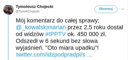 We wczorajszym programie #IPPTV Paweł Chojecki obraził Stanisława Tymińskiego. O ile można dyskutować z jego poglądami politycznymi to nie ulega wątpliwości że Stanisław Tymiński zdobył majątek dzięki swym zdolnościom i ciężkiej pracy a jej owocami dzieli się z potrzebującymi np. w Ameryce Łacińskiej. Był też pierwszym politykiem, który usiłował powiedzieć nam prawdę o Lechu Wałęsie. Jest też jedyną osobą publiczną która poparła mnie w kampanii prezydenckiej 2015. Po głupiej napaści na Stanisława Tymińskiego nie mam już żadnych skrupułów wobec P.CH.