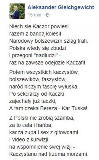 Aleksander Gleichgewich jest znany ze swojej nieustającej sympatii do KOD, a także z wierszyka „Niech się Kaczor powiesi razem z bandą kolesi”