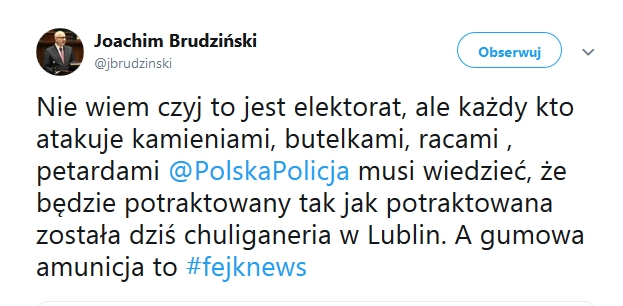 Przy tej nienawiści Brudzińskiego do narodowców obawiam się o przebieg tegorocznego Marszu Niepodległości. W Lublinie obyło by się bez kamieni i rac, gdyby policja nie zaczęła pacyfikować patriotów! To policja doprowadziła do konfrontacji. Oby to się nie powtórzyło 11.11.