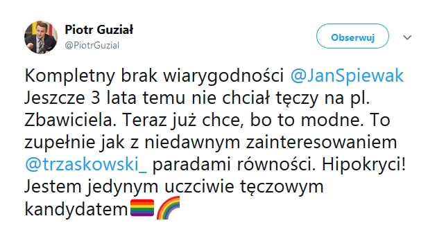 W Warszawie podobną deklarację podpisał podobno tylko Jan Śpiewak z lewicowego komitetu Wygra Warszawa. Śpiewak zapowiedział, że osoby LGBTQXYZHUFF będą mogły liczyć na wykwit tęczy, w przypadku, gdy zwycięży jego komitet.