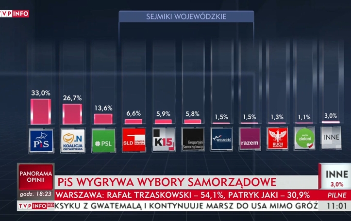 A właściwie na wstępne sondaże. Dziś [22.10.2018] rano IPSOS opublikował wyniki tzw. late poll. Różnią się one od poprzednich: PiS dostało 33%, KO – 26.7%, PSL – 13.6, SLD – 6.6%, Kukiz – 5.9%, a Bezpartyjni Samorządowcy – 5.8%. Frekwencja wyniosła ponad 53%, przy czym w Warszawie 65.84% {TUTAJ}. Oficjalne wyniki będą prawdopodobnie pojutrze, ale już teraz runęła lawina komentarzy. Salon24 zebrał {TUTAJ} głosy publicystów: