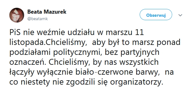 Dzwonkiem alarmowym powinny być słowa ministra Glińskiego, który na pytanie redaktora Roberta Mazurka, czy wyobraża sobie wspólny marsz z Tuskiem, Biedroniem, Scheuring-Wielgus odpowiedział: Wyobrażam sobie. (…) Ja zapraszam wszystkich, i taka jest koncepcja marszu, bo wszyscy mają prawo pójść w N A S Z Y M marszu. W „naszym marszu” ? Osobliwie brzmią te słowa w ustach przedstawiciela środowiska, które każdorazowo od 2013 roku, w dniu 11 listopada, uciekało w tchórzliwy sposób z Warszawy, zostawiając polską młodzież na pastwę zwyrodniałej policji za „rządów” PO.