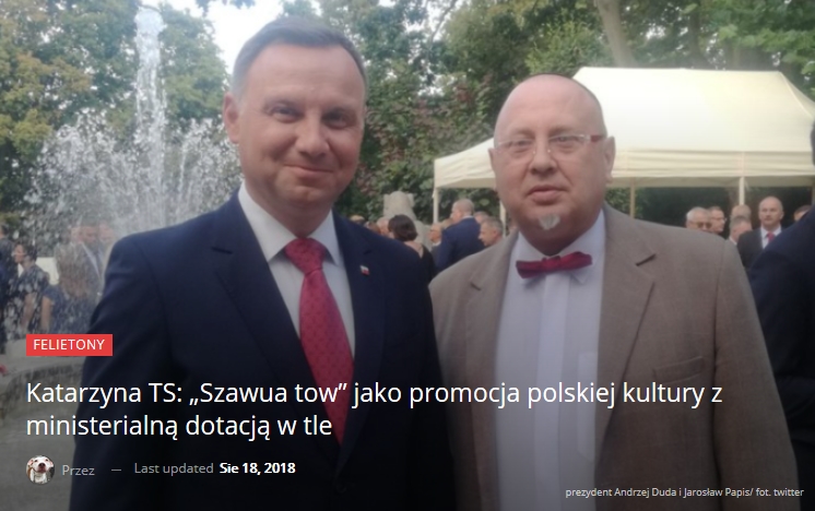„Szawua tow”, drodzy Czytelnicy. Nie wiecie, co to znaczy? Ja też nie wiedziałam, ale sprawdziłam. To życzenia „Dobrego tygodnia”, które Żydzi składają sobie po zakończeniu Hawdali, czyli nabożeństwa kończącego szabat i rozpoczynającego nowy tydzień. Dlaczego o tym piszę? Dlatego, że takie życzenia zamieszcza na swoim Twitterze bohater mojego dzisiejszego felietonu, którego widzicie na zdjęciu obok prezydenta Dudy. Ten pan nazywa się Jarosław Papis i jest prezesem Fundacji Trzeci Wymiar Kultury. I właśnie dostał 130 tysięcy złotych dotacji od Biura Programu Niepodległa podlegającego Ministerstwu Kultury i Dziedzictwa Narodowego. – dalsza cześć felietonu – link