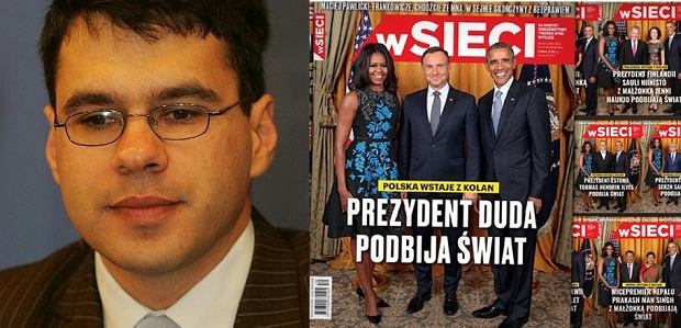 Jedna z koszmarniewjszych manipulacji Karnowskich: “Prezydent Duda podbija świat” wstawiony w szablon Photoshopu, między postacie Baracka i Michelle Obamów.