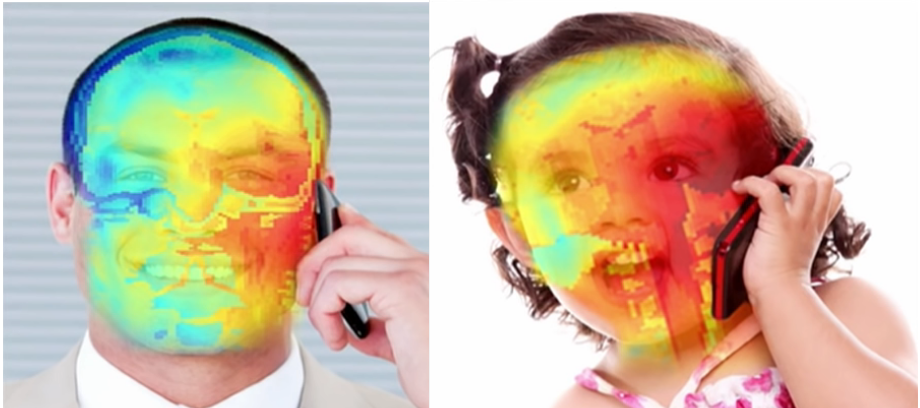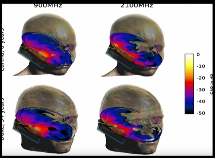 Ekspozycja na promieniowanie a wielkość głowy (modelowanie komputerowe) [3]. Porównanie głowy 8 (u góry) i 34 -latka, przy emisji w paśmie 900 oraz 2100 MHz: