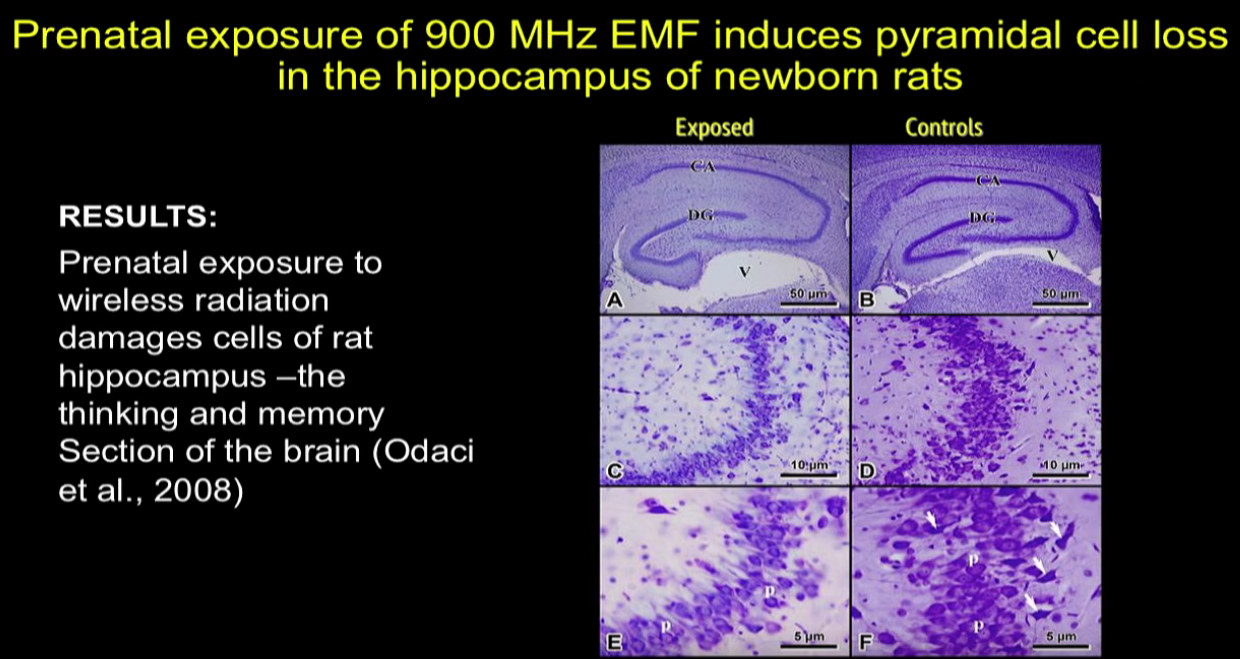 Zmiany w hipokampie szczurów poddanych działaniu fal 900 MHz (lewa strona – grupa napromieniowywana, prawa – grupa kontrolna) [3].