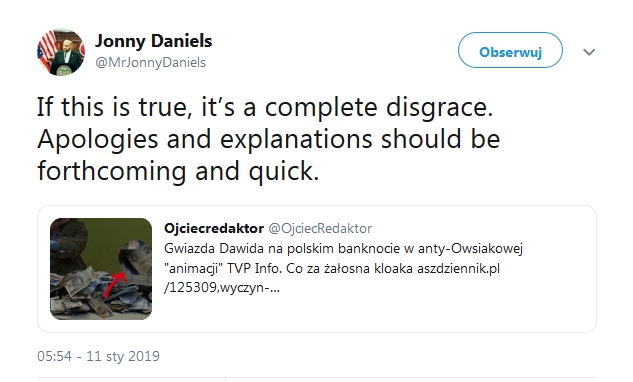 – napisał rządowy doradca PiS Jonny Daniels, posiłkując się donosem z lewicowego portalu.