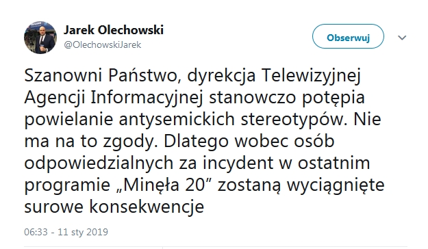Natychmiast po tym tweecie (po 39 minutach) były dziennikarz Newsweeka, aktualny szef TAI Jarosław Olechowski zagrzmiał o antysemityzmie i ukaraniu winnych.