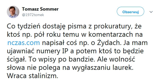 Zapewne teraz mój bankietowy rozmówca był pod Pałacem Kultury na wiecu milczenia po śmierci Pawła Adamowicza. Za kilka dni zobaczę go w telewizji lub usłyszę w radiu, jak wzywa do walki z mową nienawiści”. Link do felietonu