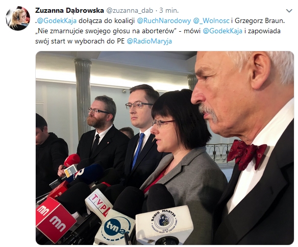 Kaja Godek, Prezes Fundacji Życie i Rodzina dołączyła dziś do polskiej koalicji tworzonej przez Ruch Narodowy, Partię Wolność i Grzegorza Brauna (Pobudka)