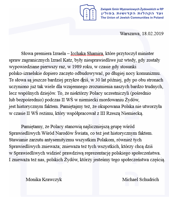 Pan Szczerski w wywiadzie dla RMF mówi najpierw o mądrych i szlachetnych Żydach jako wstęp do komunikatu o powyższym oświadczeniu, zatem już na wstępie ocenia oświadczenie jako mądre i szlachetne. Cytuję słowa lektora w TVP, które następują potem: “wspólne oświadczenie potępiające wypowiedź szefa izraelskiego MSZ”. Przecież żadne potępienie nie ma w oświadczeniu miejsca. Żydzi z Schudrichem na czele piszą jedynie, że dzisiaj jest im przykro, z powodu słów Israela Katza, bo nie ułatwi ono polepszenia stosunków polsko-izraelskich. Piszą zatem o swoich zranionych uczuciach i swoim utylitarnym celu, lecz konsekwentnie przypominają, że niektórzy Polacy uczestniczyli w mordowaniu Żydów i to, że są generalnie antysemitami, za wyjątkiem Sprawiedliwych Wśród Narodów Świata. No niestety, wychodzi na to, że dopiero, jak Polak uratuje Żydowi życie to ma szansę zmazać z siebie grzech antysemityzmu.