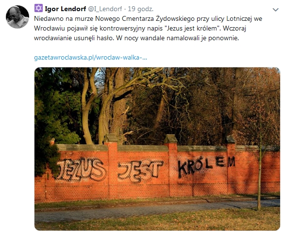 Jak donosi Gazeta Wrocławska „Wandale pomalowali mur Nowego Cmentarza Żydowskiego we Wrocławiu. W niedzielne popołudnie wrocławianie usuwali napis “Jezus jest królem” umieszczony przy wejściu głównym”.