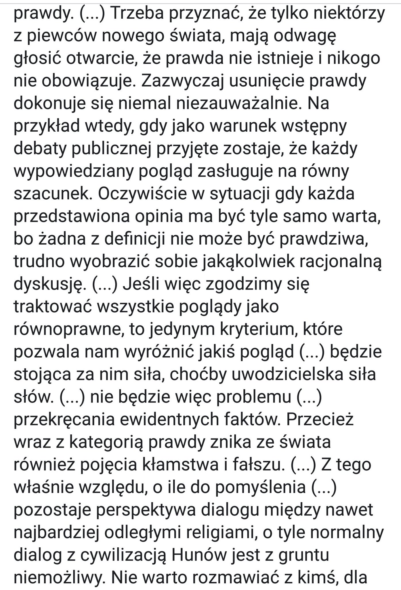 W dzisiejszych czasach demokracja postrzegana jest często jako ustrój polityczny, którego moralna wyższość nad innymi ustrojami nie podlega dyskusji. (…) Z drugiej strony nie trzeba wielkiej przenikliwości, by w ramach współczesnego państwa demokratycznego dostrzec zjawiska, które stanowią jawne wyzwanie dla porządku moralnego. W zderzeniu z właściwą dla demokracji specyficznie rozumianą ideą wolności ogólnie uznane reguły określające to, co jest dobre a co złe, wydają się zanikać, zaś ich miejsce zajmuje zasada poszanowania subiektywnych przekonań każdego człowieka i tolerancja bez granic.