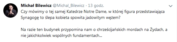 U nas ludzie już się zgłaszają gotowi złożyć datki na odbudowę Katedry Notre Dame. Dziękuję za to, bo jestem przekonany, że odbudowa Katedry może stać się symbolem odbudowy Europy. Obbudowy Europy na jej prawdziwym, historycznym, judeo-chrześcijańskim fudamencie. /pisownia oryginalna/