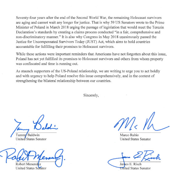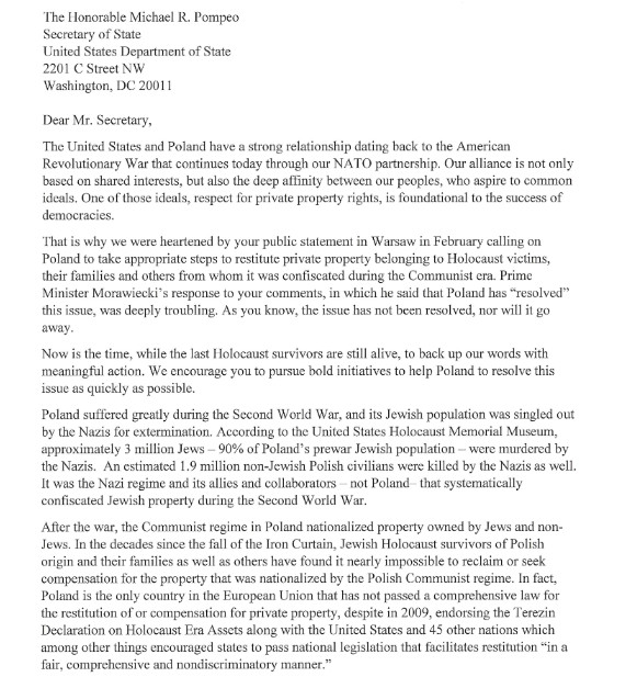 “Polska nie wypełniła jeszcze obietnic złożonych ocalałym z Holokaustu i innym osobom, których majątek został skonfiskowany”?! Kto i komu składał takie obietnice? Co obchodzą senatorów USA nasze wewnętrzne sprawy? Warto też zauważyć, że w liście została obniżona liczba polskich ofiar II Wojny Światowej z 3 mln. do 1,9 mln. (!)