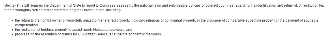 W marcu 2018 r. 59 senatorów USA napisało do premiera PiS, Morawieckiego list z apelem przyjęcia ustawodawstwa umożliwiającego realizację grabieży Polski przez Holocaust Industry. Wzmocnieniem tych żądań była podpisana przez prezydenta Trumpa ustawa 447 JUST, która nakłada obowiązek na Departament Stanu wspierania żydowskich wymuszeń. Kwotą początkową do negocjacji z rządem PiS jest 300 mld $ . Chodzi oczywiście o mienie bezspadkowe, bo o tej kategorii mienia m.in. mówią Deklaracja Terezińska, której umiłowany prezes PiS nie chce wypowiedzieć i Ustawa 447.