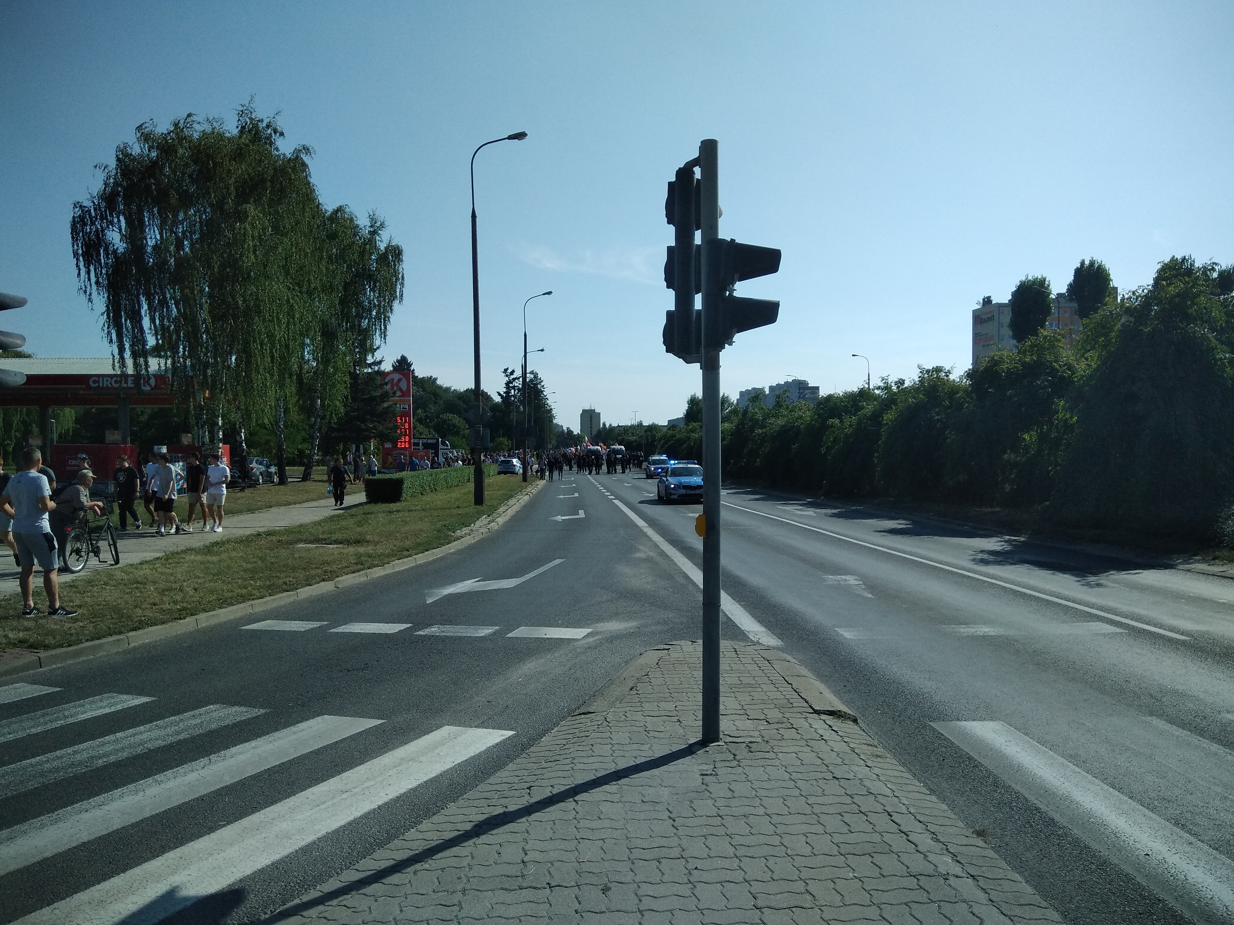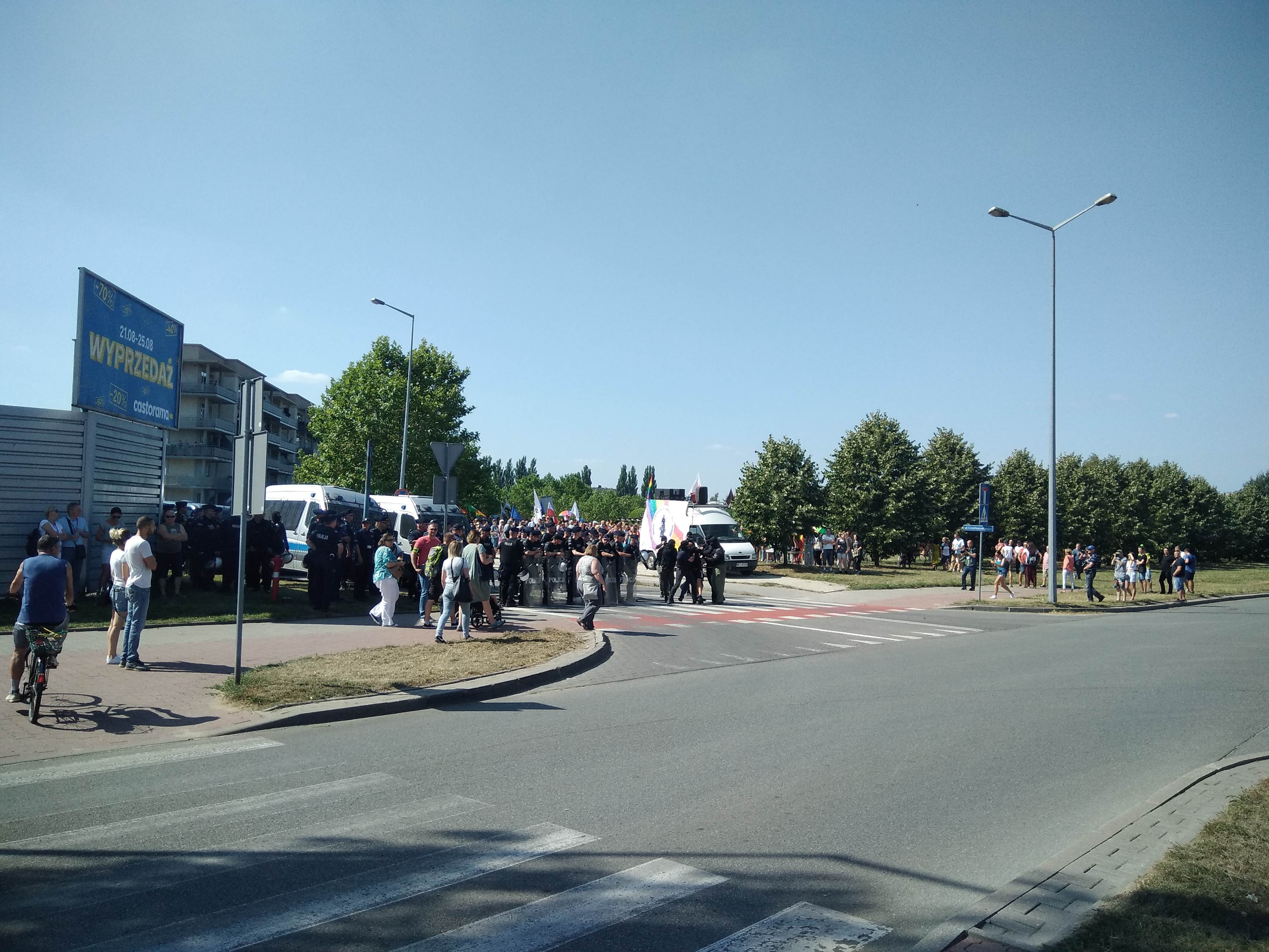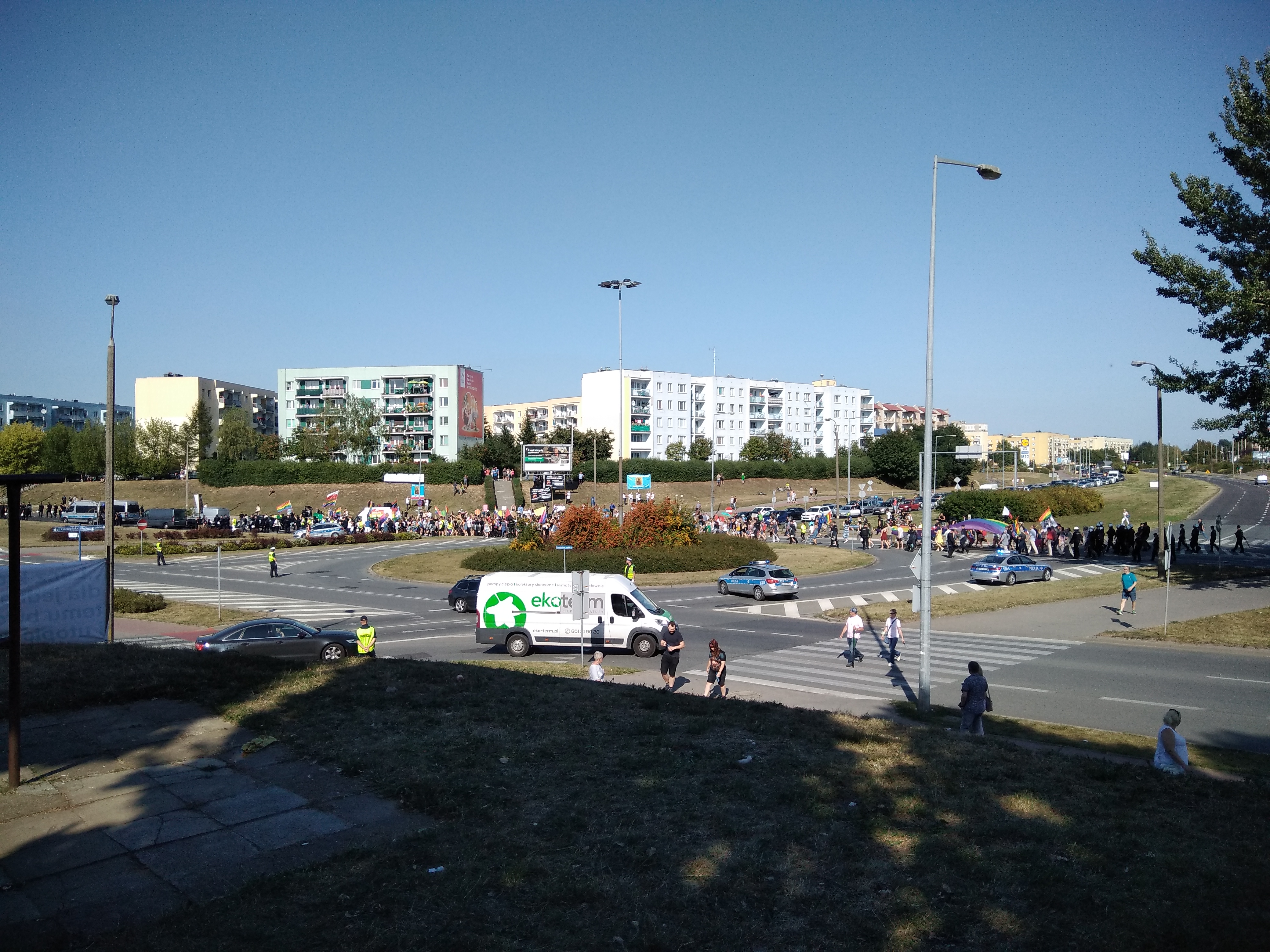 27. Manifestacja LGBT po nawrotce w Parku Kopernika. Zdjęcie wykonane ze skrzyżowania Piłsudskiego z Czereśniową. Marsz “równości” na asfalcie, chodnikiem maszerują jego przeciwnicy: