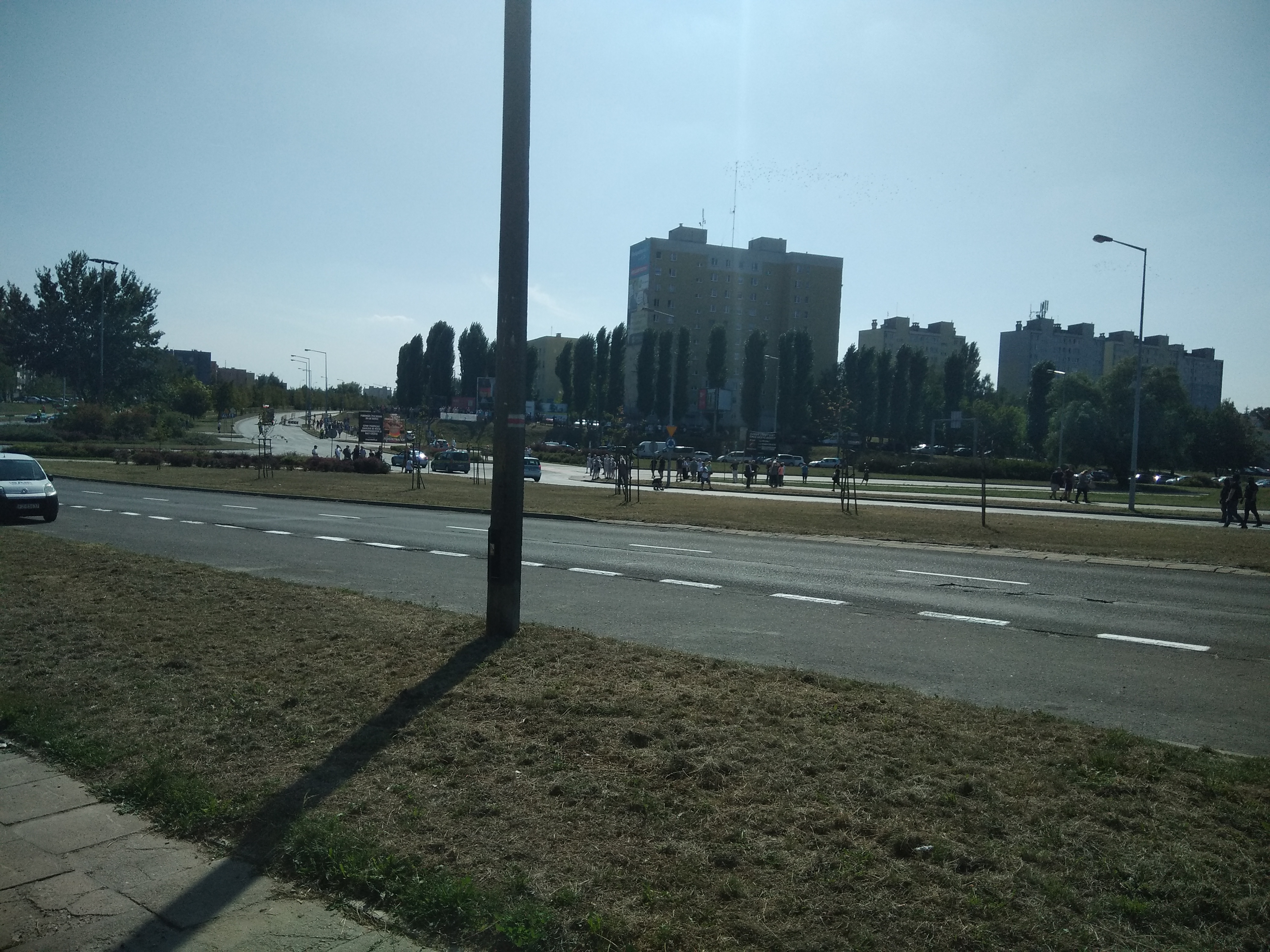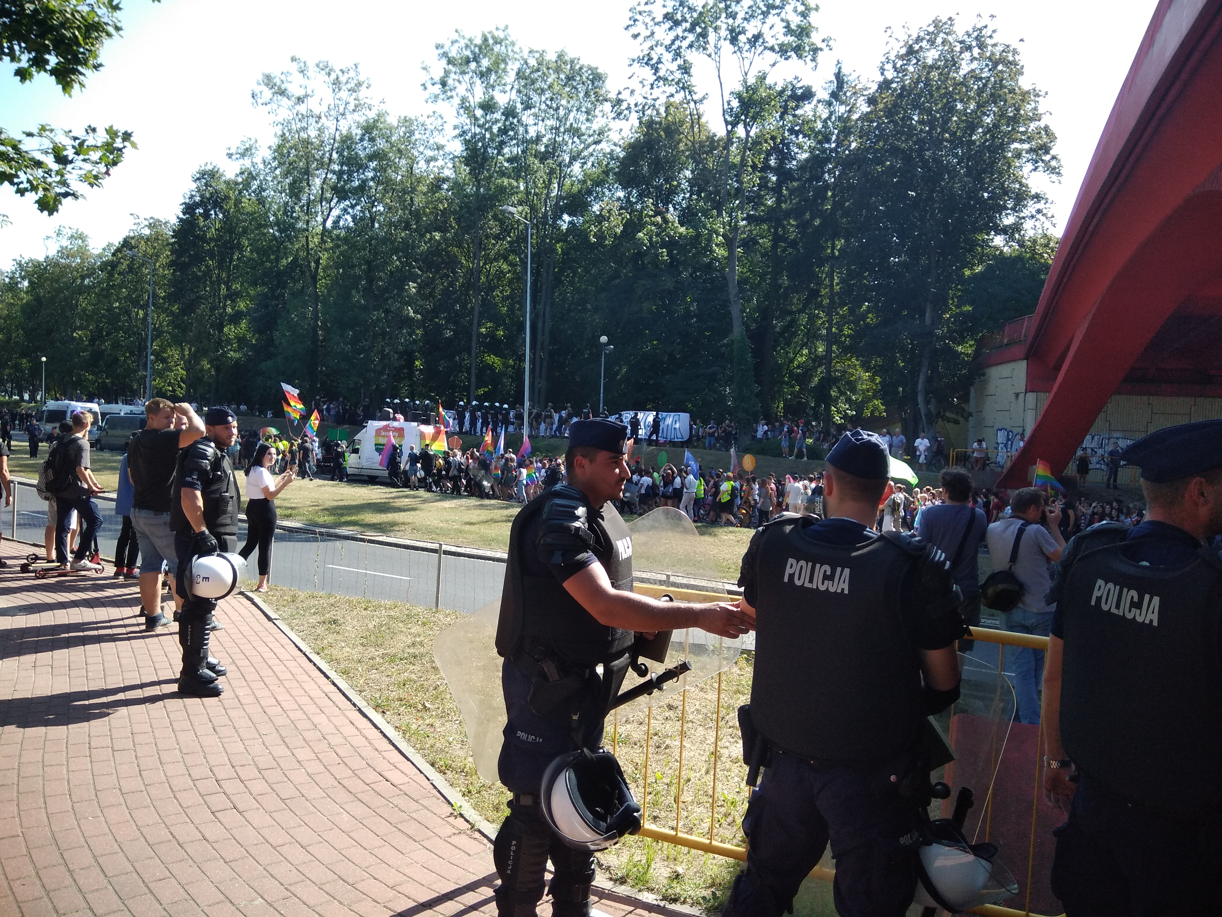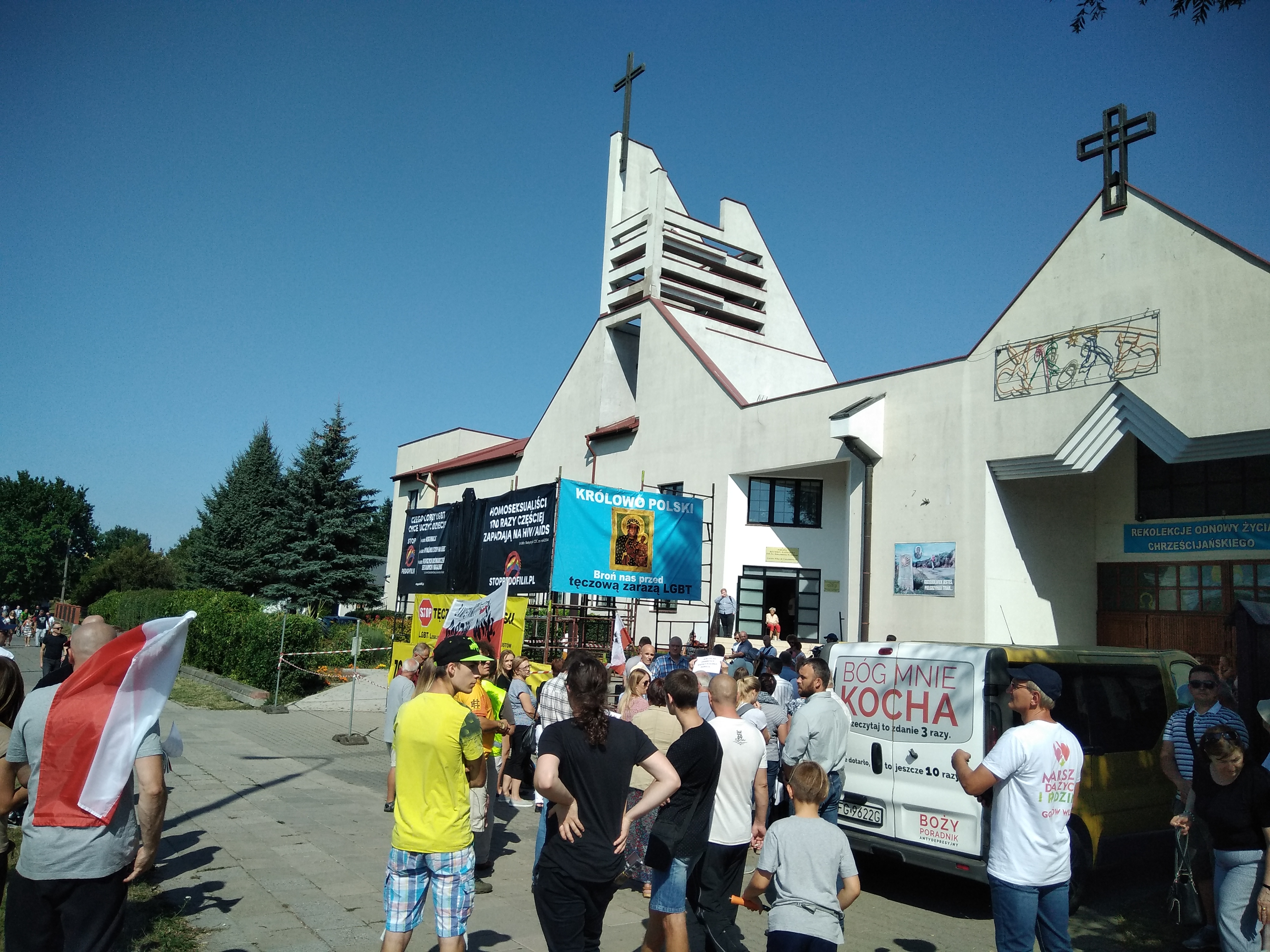 27. Manifestacja LGBT po nawrotce w Parku Kopernika. Zdjęcie wykonane ze skrzyżowania Piłsudskiego z Czereśniową. Marsz “równości” na asfalcie, chodnikiem maszerują jego przeciwnicy: