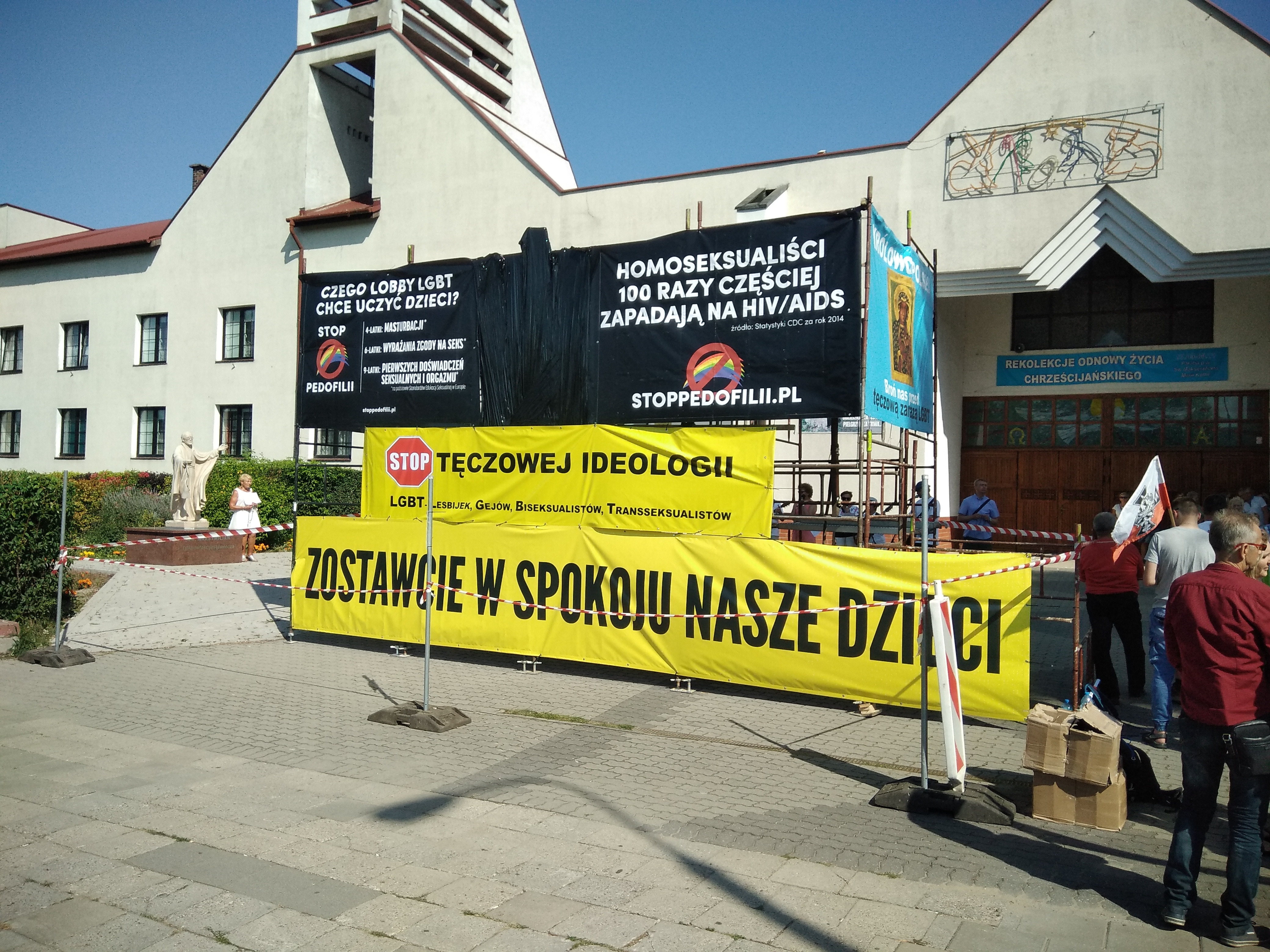 11. Kolejne grupy kontrmanifestantów. Na górce transparent z hasłem “biada temu, przez którego przychodzą zgorszenia, lepiej by mu było uwiązać kamień młyński u szyi i pogrążyć go w głębokościach morskich”