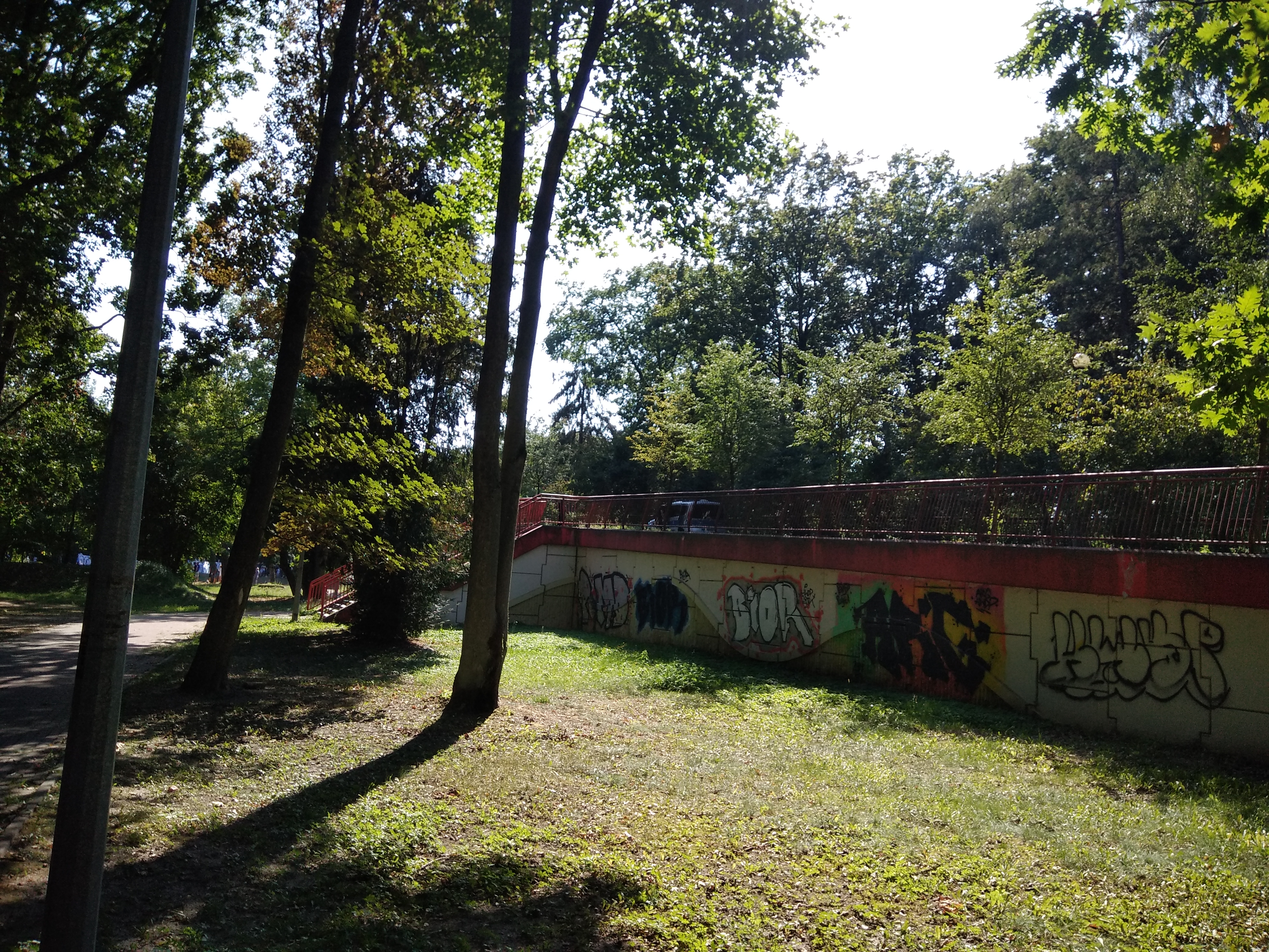 24. Kładka dla pieszych w Parku Kopernika. Nie zdążyłem nagrać momentu, w którym policja szarpała się z właścicielami transparentu “Dewianci LGBT won z Gorzowa”. Początkowo to właśnie tam miał ten baner zawisnąć, czyli pod trasą przemarszu: