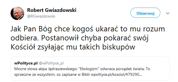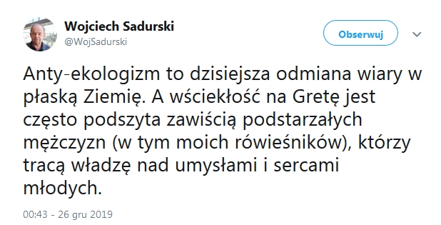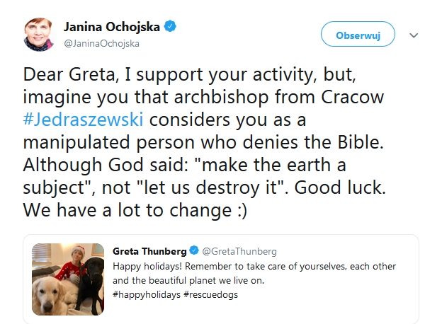“Droga Greto, popieram twoją aktywność, ale wyobraź sobie, że arcybiskup z Krakowa Jędraszewski uważa Cię za manipulowaną osobę, która zaprzecza Biblii. Chociaż Bóg powiedział: “Czyńcie ziemię poddaną”, nie “Pozwól nam zniszczyć”. Powodzenia. Mamy wiele do zmiany :)”.
