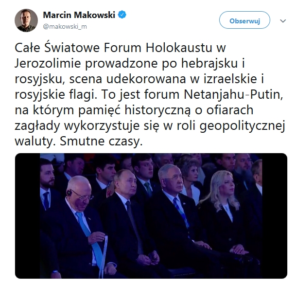 Światowe Forum Holokaustu – czy Putin wypowiedział się miękko, czy nie – to w warstwie narracji historycznej praktyczne wymazanie Polski z dziejów II wojny światowej, marginalizacja Aliantów Zachodnich, gloryfikacja Armii Czerwonej i walecznego ducha Francuzów. Tak to wygląda.