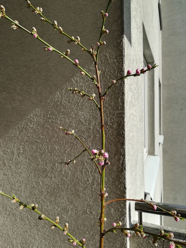 Z zainteresowaniem obserwuję zakwitającą mi na balkonie na różowo brzoskwinię.