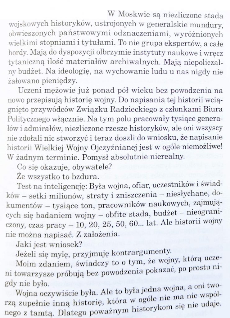Zadałem nieco prowokacyjne pytanie „ile w tym tekście [ tzn. tekście Wiktora Suworowa w książce ‚ Klęska”] trzeba zmienić, aby napisać o naszych oficjalnych/etatowych historykach, niezdolnych mimo upływu lat do napisania historii np. najstarszej polskiej uczelni w czasach komunizmu i stanu wojennego, do tej pory nie wykrytych w jego dziejach ? „.