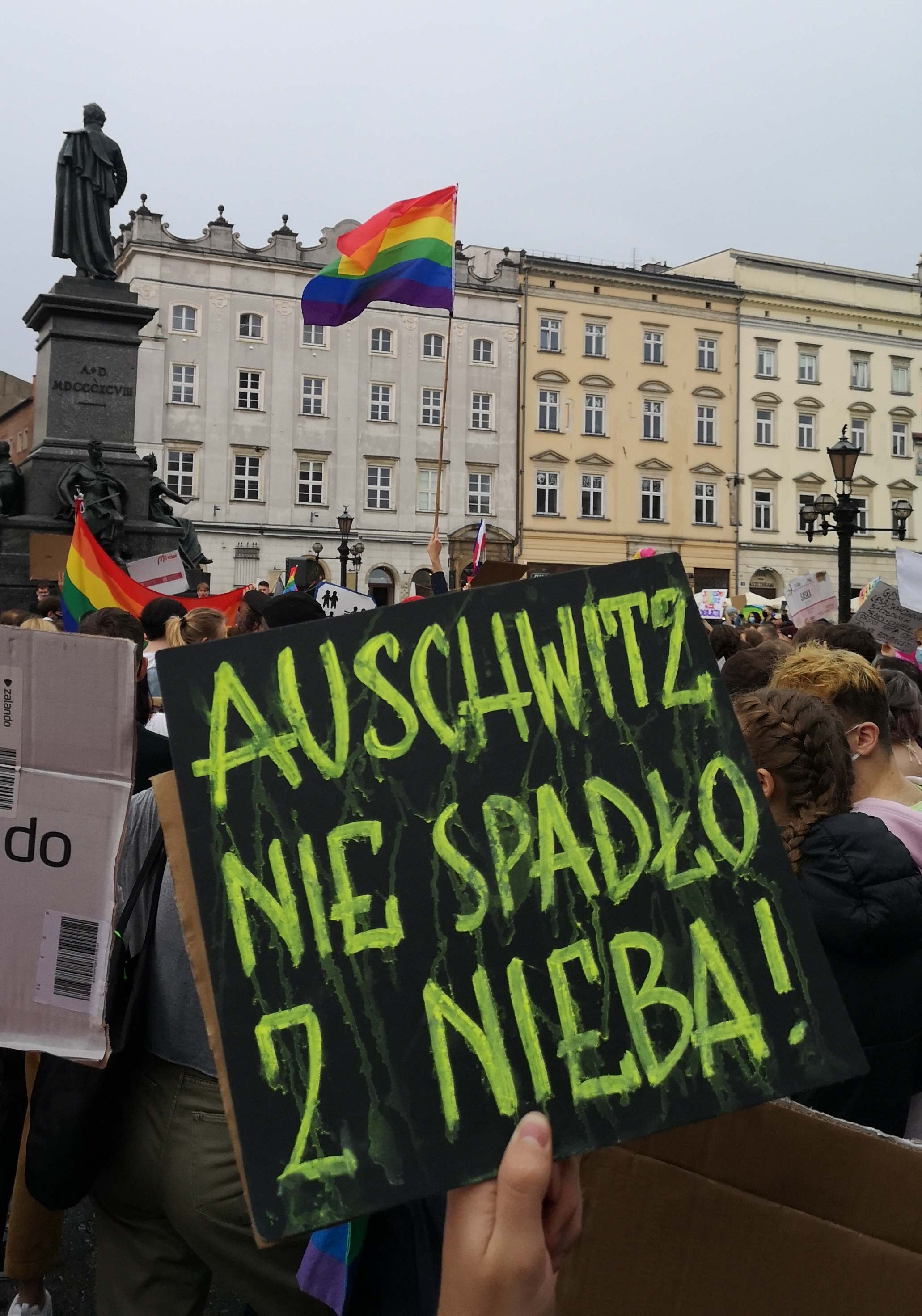jasno nawiązujące do znanej wypowiedzi red. Polityki – Mariana Turskiego 27 stycznia tego roku w Auschwitz/Birkenau, którą to wypowiedź analizowałem w zapewne nieznanym manifestantom tekście w Kurierze WNET i na moim blogu. [Auschwitz nie spadł nam z nieba, komunizm też! – https://blogjw.wordpress.com/2020/03/14/auschwitz-nie-spadl-nam-z-nieba-komunizm-tez/]