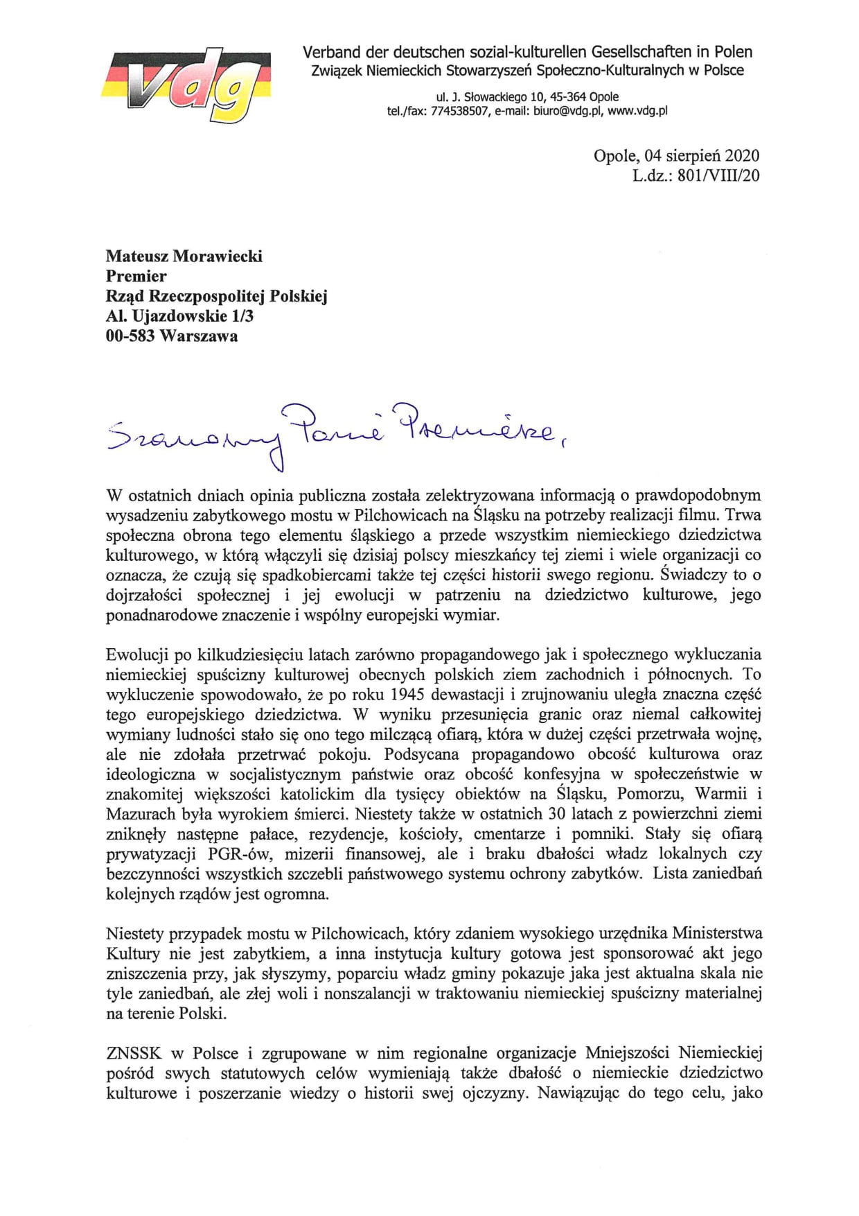 4 sierpień 2020 – Bernard Gaida Przewodniczący ZNSSK (… “najważniejszy” Niemiec poza krajem ojczystym…) wystosował pismo do Premiera Rządu RP Mateusza Morawieckiego w sprawie obrony oraz zachowania zabytkowego mostu w Pilchowicach na Dolnym Śląsku.