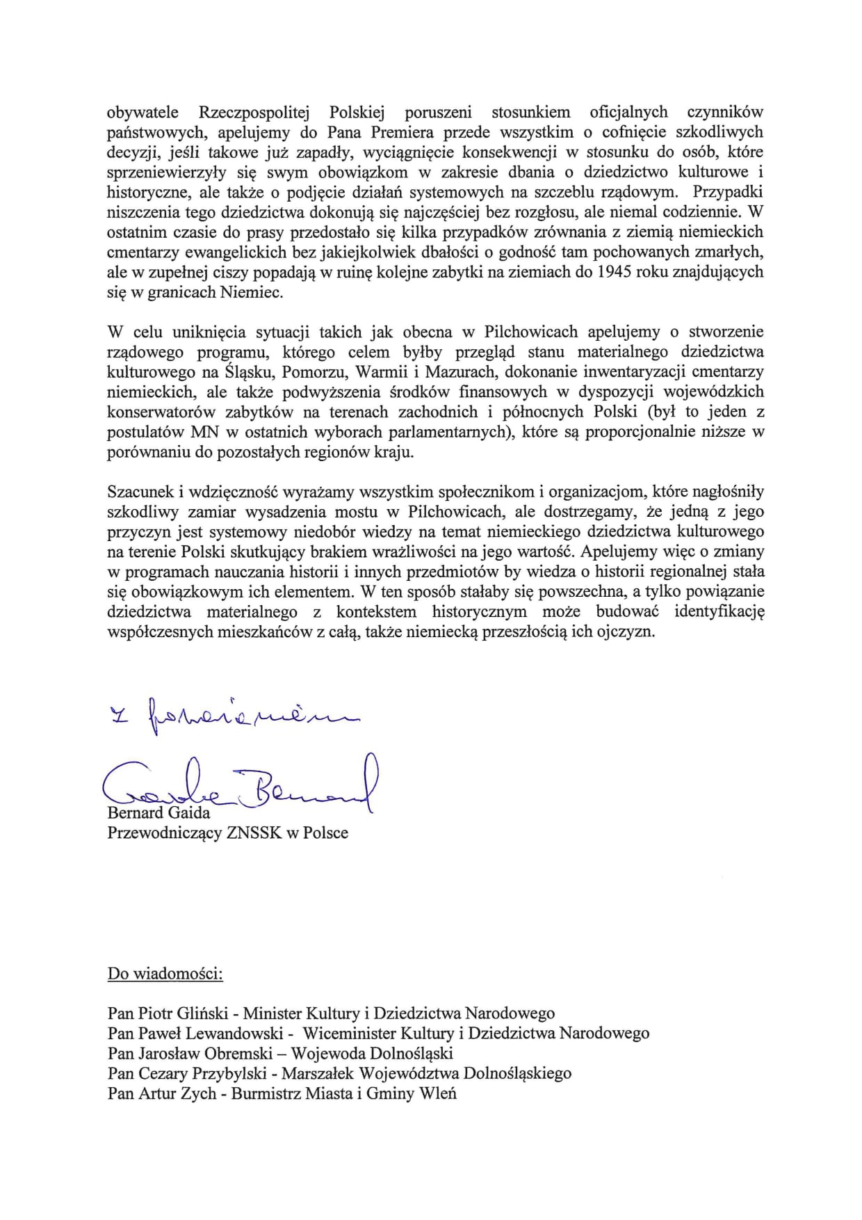 List otwarty do Premiera Rządu RP Mateusza Morawieckiego, jako apel w sprawie obrony oraz zachowania zabytkowego mostu w Pilchowicach na Dolnym Śląsku, będący elementem niemieckiego dziedzictwa kulturowego i historycznego tego regionu.