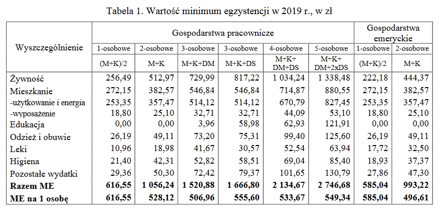 Na stronie Instytutu Pracy i Spraw Socjalnych, w pliku PDF widnieje aktualny wskaźnik określany mianem „Wartość minimum egzystencji w 2019r., w zł”. Wskaźnik ten jest ustalony na poziomie 616,55 zł na osobę. W przypadku emeryta kwota ta jest jeszcze mniejsza i wynosi 585,04 zł.