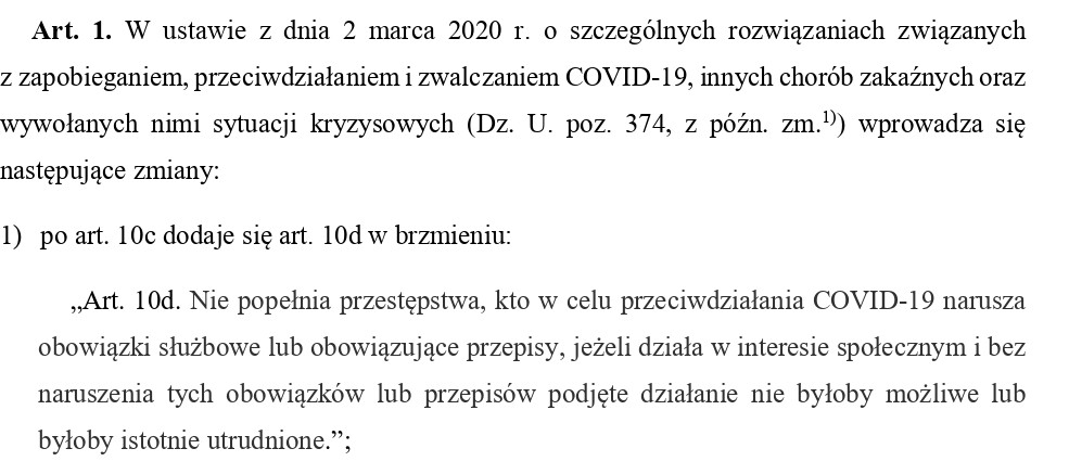 „Art. 10d. Nie popełnia przestępstwa, kto w celu przeciwdziałania COVID-19 narusza obowiązki służbowe lub obowiązujące przepisy, jeżeli działa w interesie społecznym i bez naruszenia tych obowiązków lub przepisów podjęte działanie nie byłoby możliwe lub byłoby istotnie utrudnione.”;