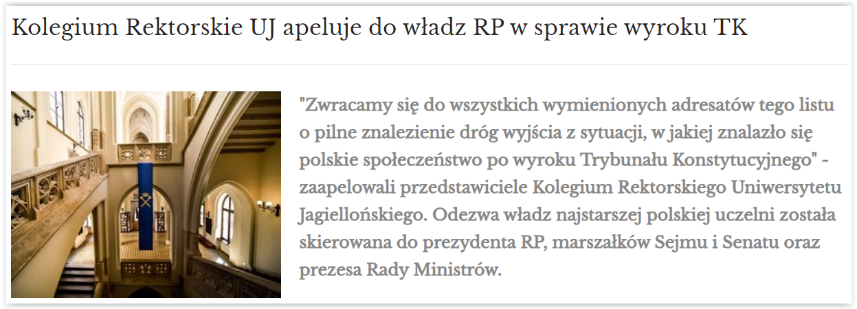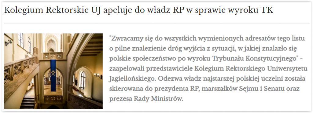 Nie mogę jako Obywatel nie zareagować na: ‚Apel Kolegium Rektorskiego Uniwersytetu Jagiellońskiego do Władz RP w sprawie wyroku Trybunału Konstytucyjnego’ z dnia 22 października 2020 r. wystosowany do :